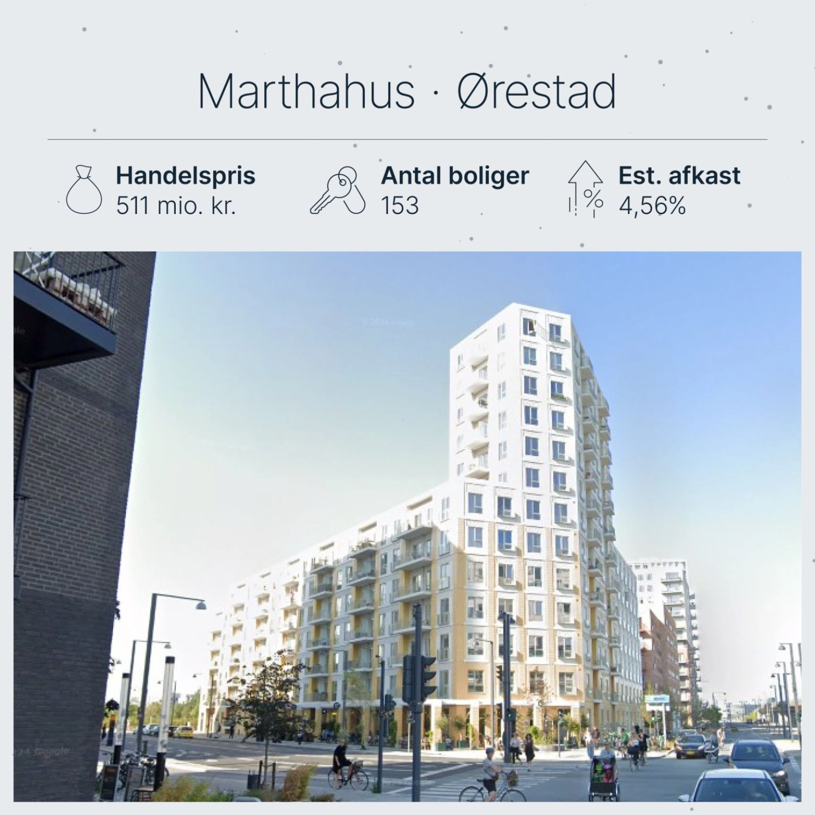 En af første kvartals største transaktioner omhandler den nyopførte boligejendom Marthahus i Ørestad, som AkademikerPension købte for lidt over en halv milliard kroner.