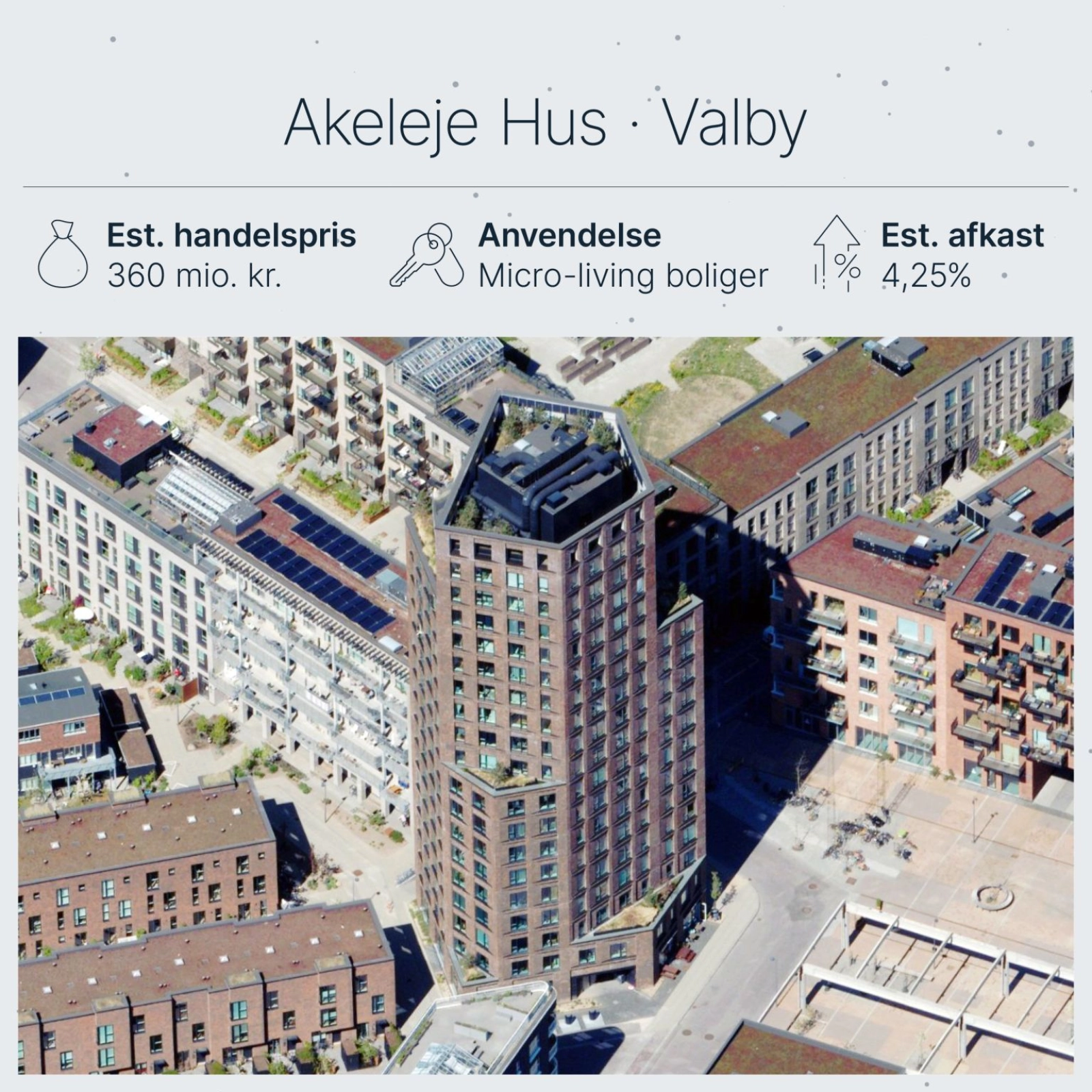 Akeleje Hus i Valby rummer 189 micro-living boliger, et erhvervslejemål og 27 p-pladser. Boligerne udlejes til ca. 2.500 kr./m², og ejendommen handles til et afkast på 4,25 %. Data om lejeniveauer,