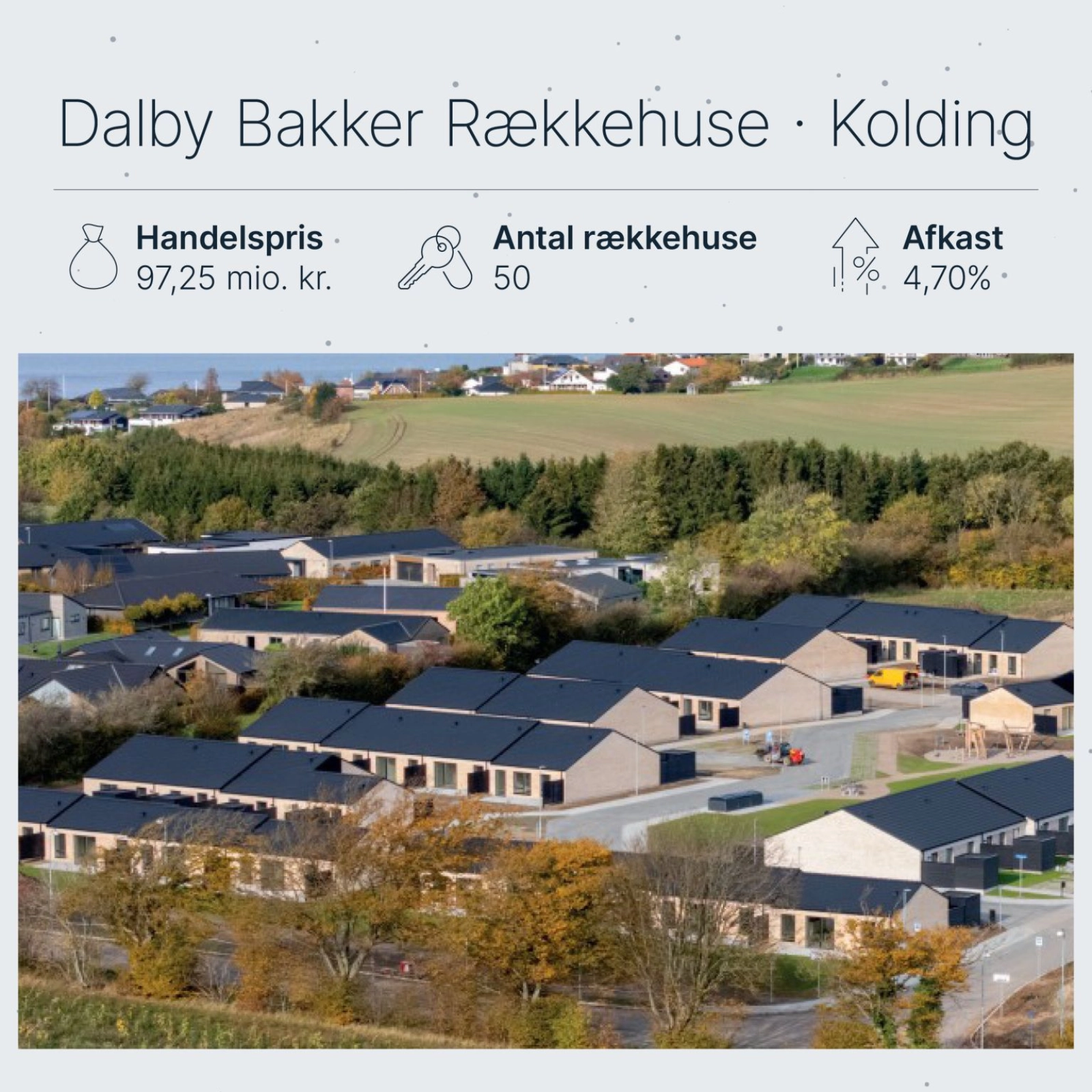 Birch Ejendomme har netop solgt et nyopført rækkehuskompleks i Dalby ved Kolding til formueforvalteren Vinding Gruppen. Komplekset består af 50 et-plans rækkehuse med et samlet lejebærende areal på