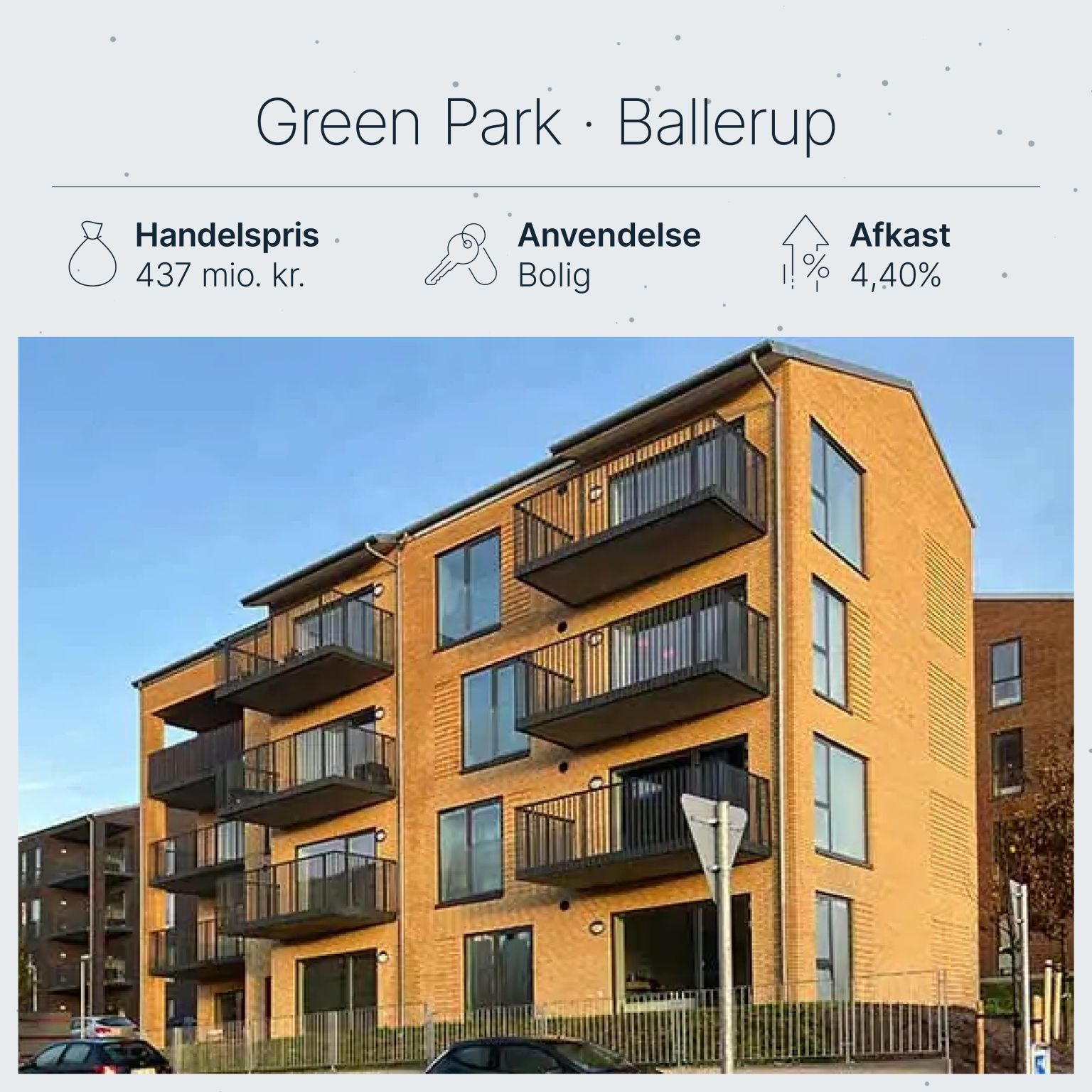 Ejendommen er handlet til et afkast i niveauet 4,40% – i tråd med markedsniveauet for nyopførte, fuldt udlejede boligprojekter med stabil drift og lav vedligeholdelsesprofil.