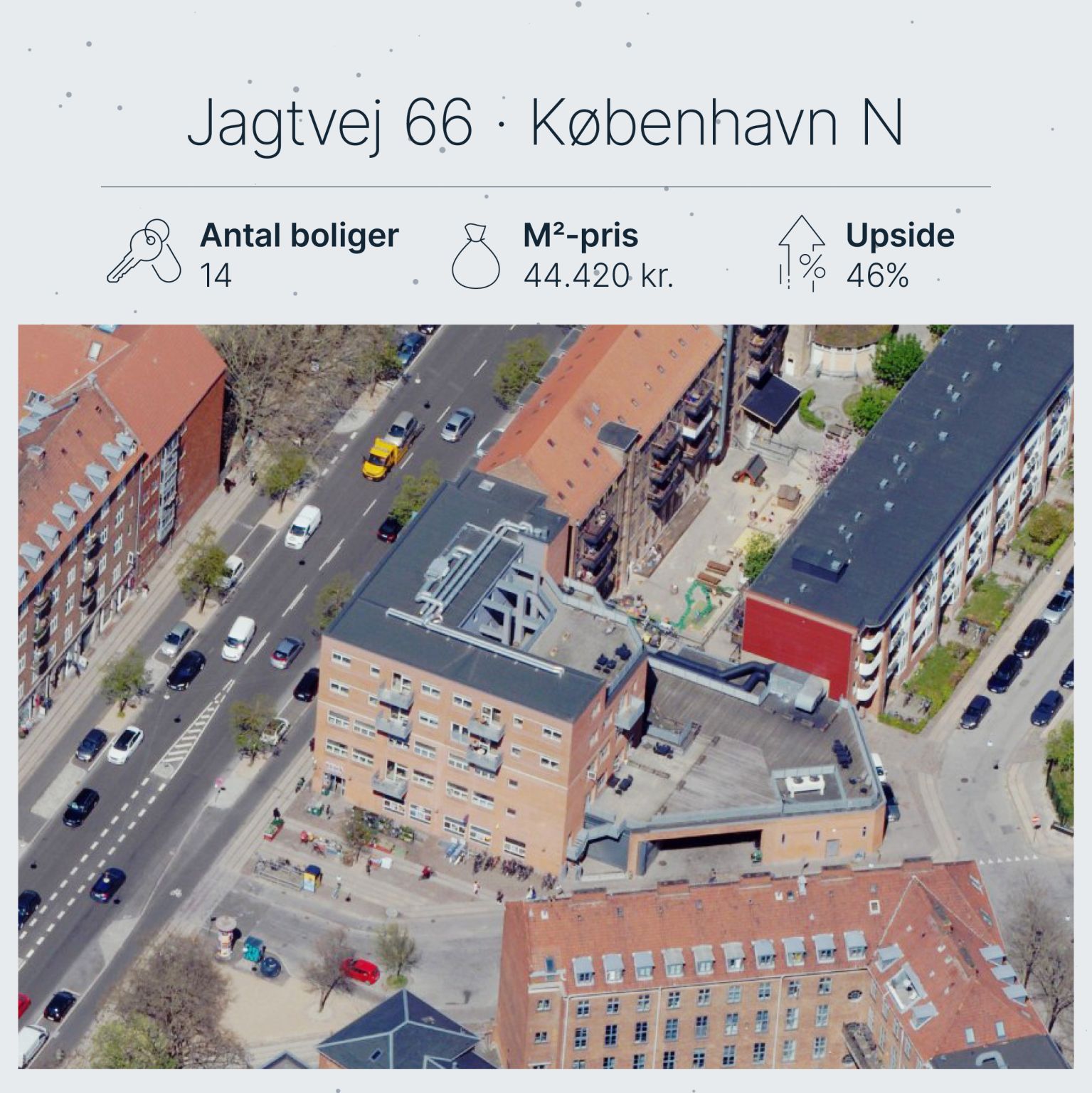Ejendommen er handlet til 71,25 mio. kr. og består af 14 ejerlejlighedsopdelte boliger med et samlet lejebærende areal på 1.604 m², svarende til en kvadratmeterpris på 44.420 kr.