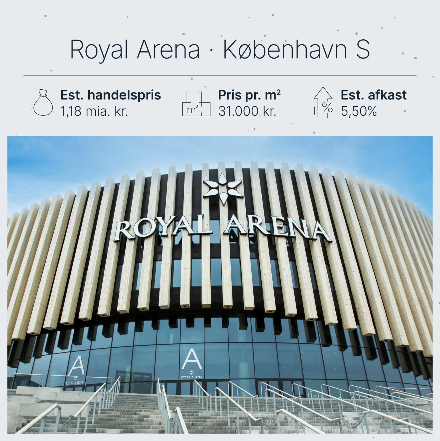 Baseret på en estimeret handelspris på 1,18 mia. kr., som er den seneste bogførte værdi af ejendommen, er Royal Arena handlet til et afkast på 5,50%, såfremt Live Nation ikke erhvervede ejendommen til eget brug.